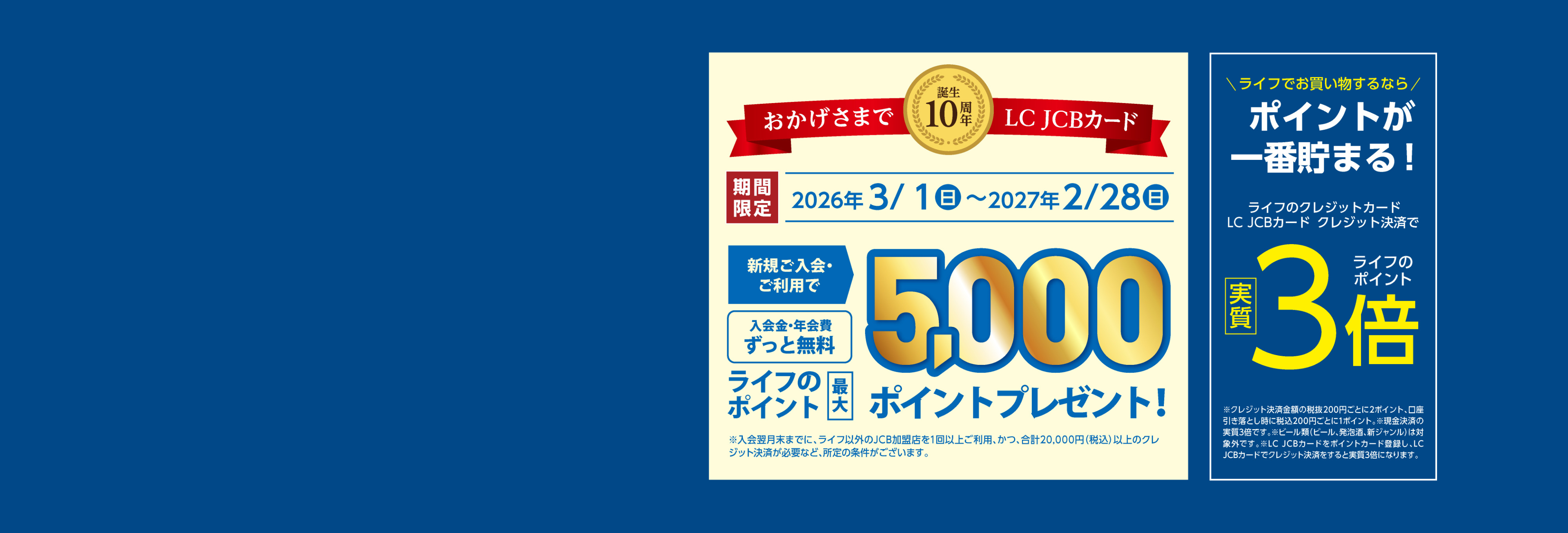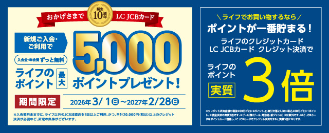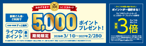 【おかげさまでLC JCBカード誕生10周年】LC JCBカード新規ご入会・ご利用でライフのポイント最大5,000ポイントプレゼント!